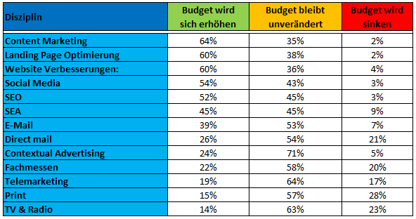 Bei Content Marketing möchten 64% der Befragten die Budgets erhöhen und bei Landing Page Optimierung (damit dürfte Conversion Rate Optimierung gemeint sein) beabsichtigen immerhin noch 60% eine Budget-Erhöhung genau wie bei Verbesserungen der Website.
